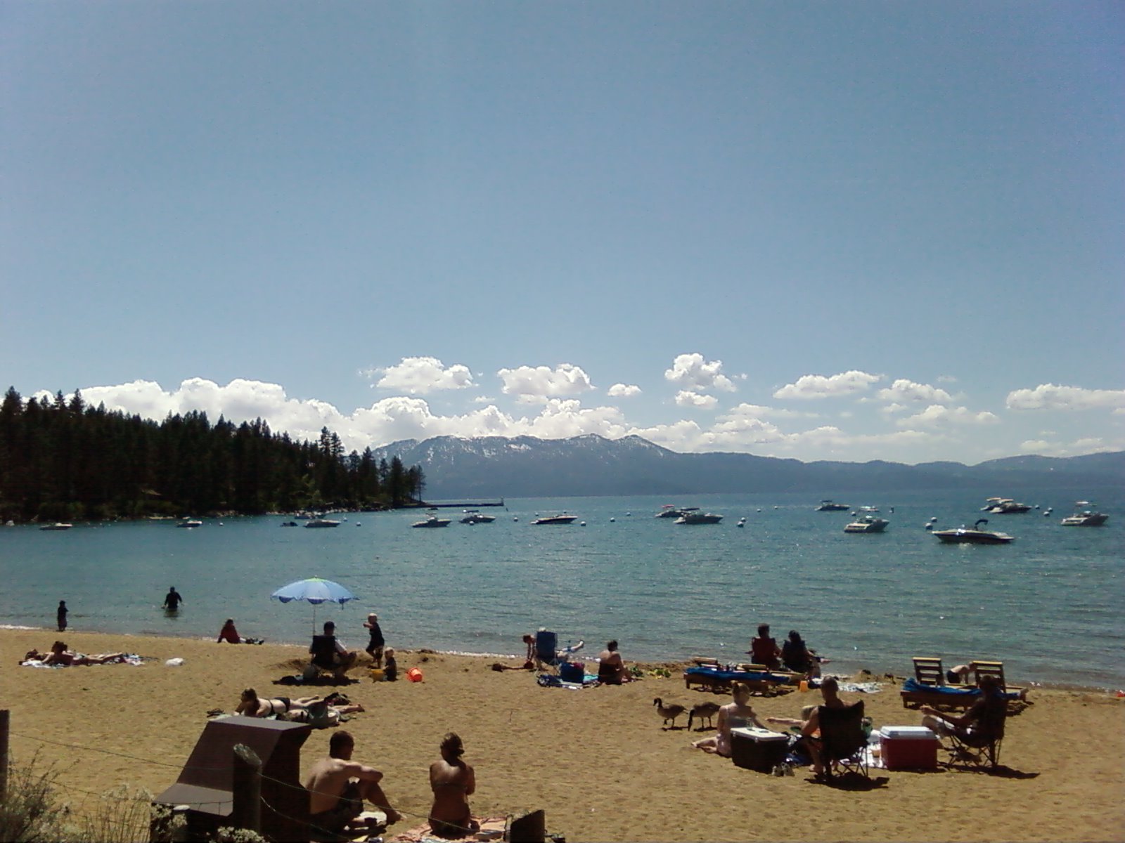 Tourists, boats, geese |