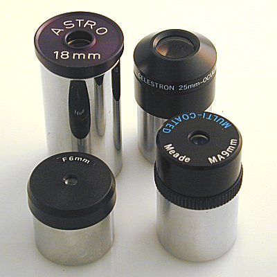 - Tuthill Astro 18mm, Celestron 25mm Kellner, Celestron 6mm (unknown) and Meade Modified Acromatic 9mm.