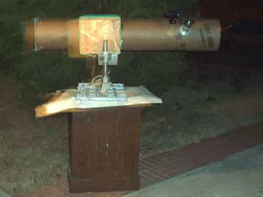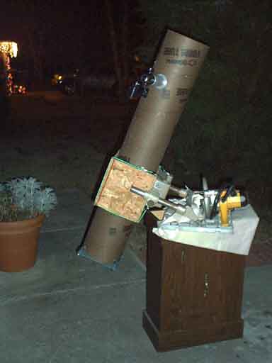 - Tuesday 2001/12/18 - Attached PC slot covers to the spider. Cut hole for focuser and mounted it. Mounted spider. Colimated scope. Took it out into the night for it's first test, sans mount (that means I set it on a door mat and leaned it against the BBQ grill).